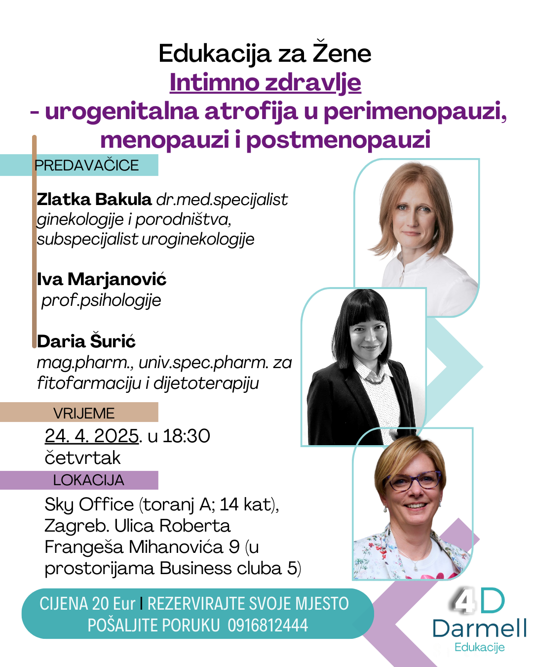 U Zagrebu je 13.03.2025. održana druga edukacija u ciklusu interaktivnih 4D Darmell edukacija posvećenih perimenopauzi i menopauzi. Predavačice su bile Natalija Kanački, dr. med., te osnivačica projekta Daria Šurić, mag. pharm., univ. spec. pharm. fitofarmacije s dijetoterapijom.